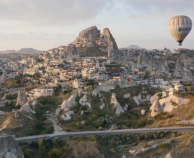 Located in the heart of the Cappadocia. Uchisar town offers a breathtaking escape. Uchisar, the highest point in this captivating region, allows visitors to fully immerse themselves in panoramic views that stretch from the majestic Kayseri Erciyes Mountain to the unique valleys of Rose Valley, Pigeon Valley and Love Valley. The charming towns of Goreme, Cavusin, and Avanos complete this surreal environment, all while hundreds of balloons fill the skies during the early morning hours, offering an unforgettable sight.